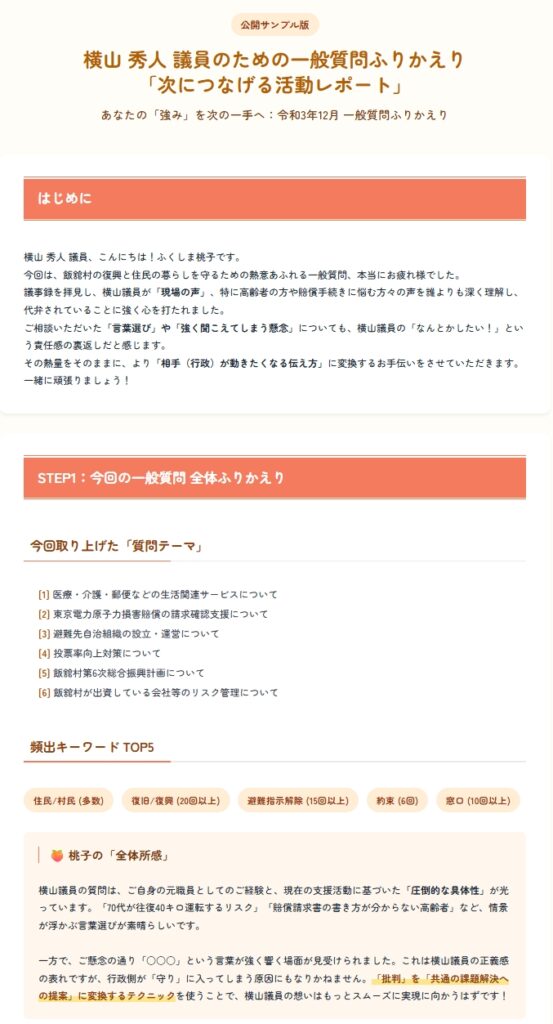 経験20年の議員秘書「ふくしま桃子」のAI分析と、現村議(元村役場職員)が代表を務める合同会社つなぐのメンバーが、あなたの質問力を“次のステージ”へ導きます。