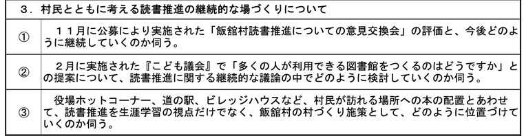 「先日、飯舘村読書推進についての意見交換会が開催されました。この参加者は、村の広報誌を通じて、広く募集されたことに、意義があると思っています。つまり、村民と一緒に考えていきたいとの表れだと思います。 また、子ども議会においても、幅広い年代の人も読めるように本を集めて多くの人が利用できる図書館をつくるのはどうですかとの提案もありました。私は、図書館は将来に向かって検討が必要と感じます。まずは、本に接すことができる場(目に触れる場)が必要と思っています。役場の待合室に自由貸出コーナー、交流ができる場所への本棚設置などが。 最も大事なのは、今回村民を交えての意見交換会の定期開催です。 これが継続的に村民と検討し、進捗状況を確認しながら、さらる改善や方法を探る。 飯舘村の生涯学習と感じます。 これを一般質問にしたいです。」