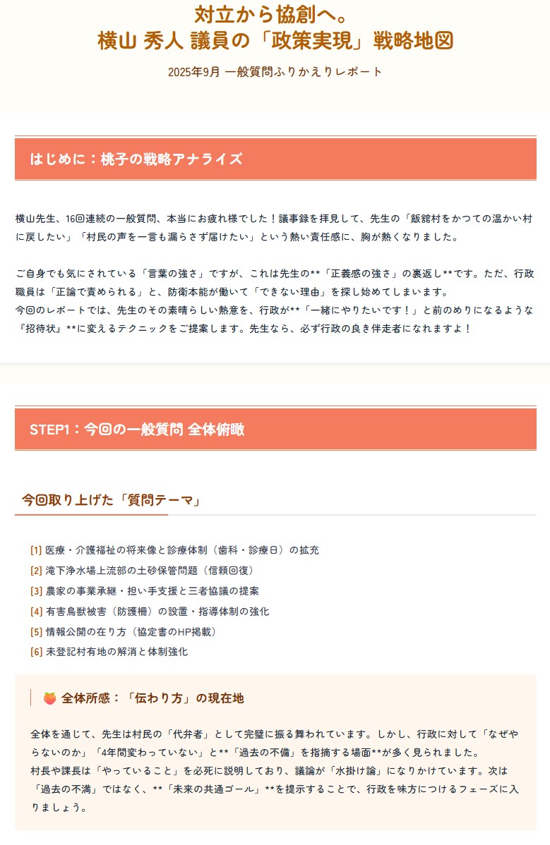 今までの一般質問を分析していただき、どこの言葉が厳しかったのかも含め、政策実現に一歩ずつ進む、質問の流れや言い方を提案して欲しいです。