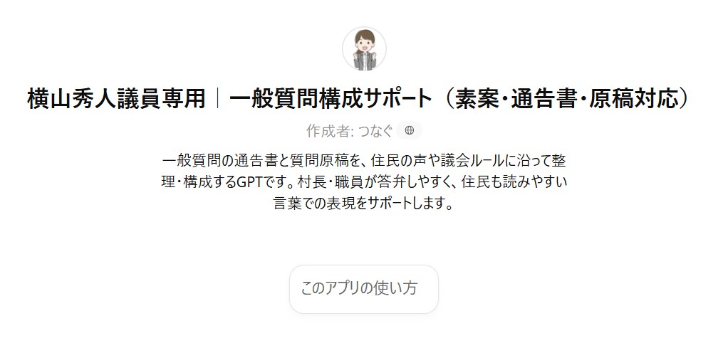 お薦めは、分析結果をもとにした一般質問構成サポートアプリ(生成AI)の利用ですね。横山さん専用のアプリです。
