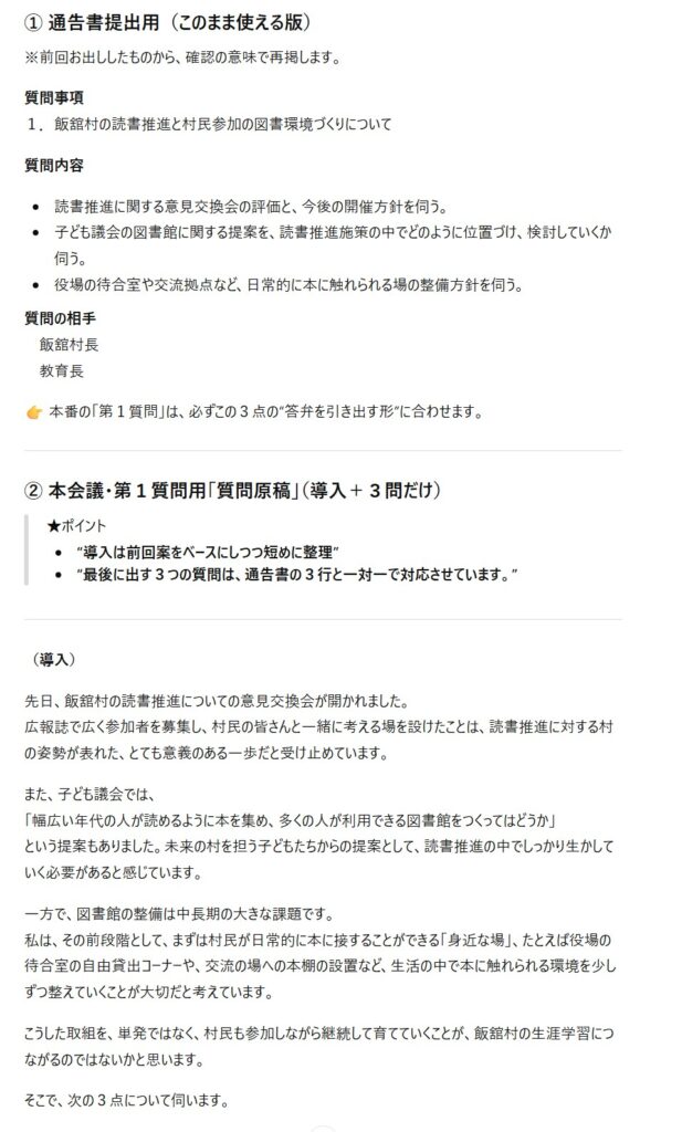 過去の議事録分析、一般質問作成専用アプリによる壁打ち、音声読上げサービスによる壁打ちと一連の流れを今回行ってみました。