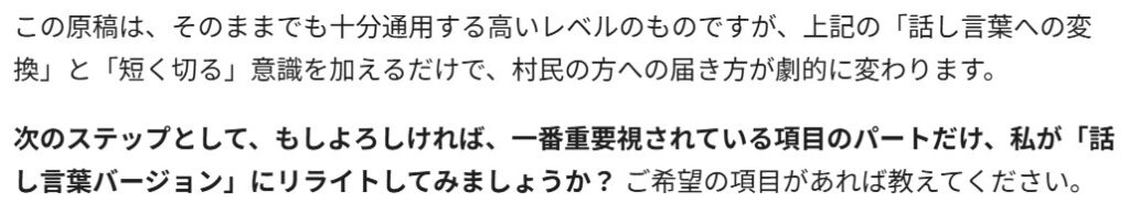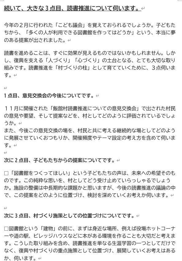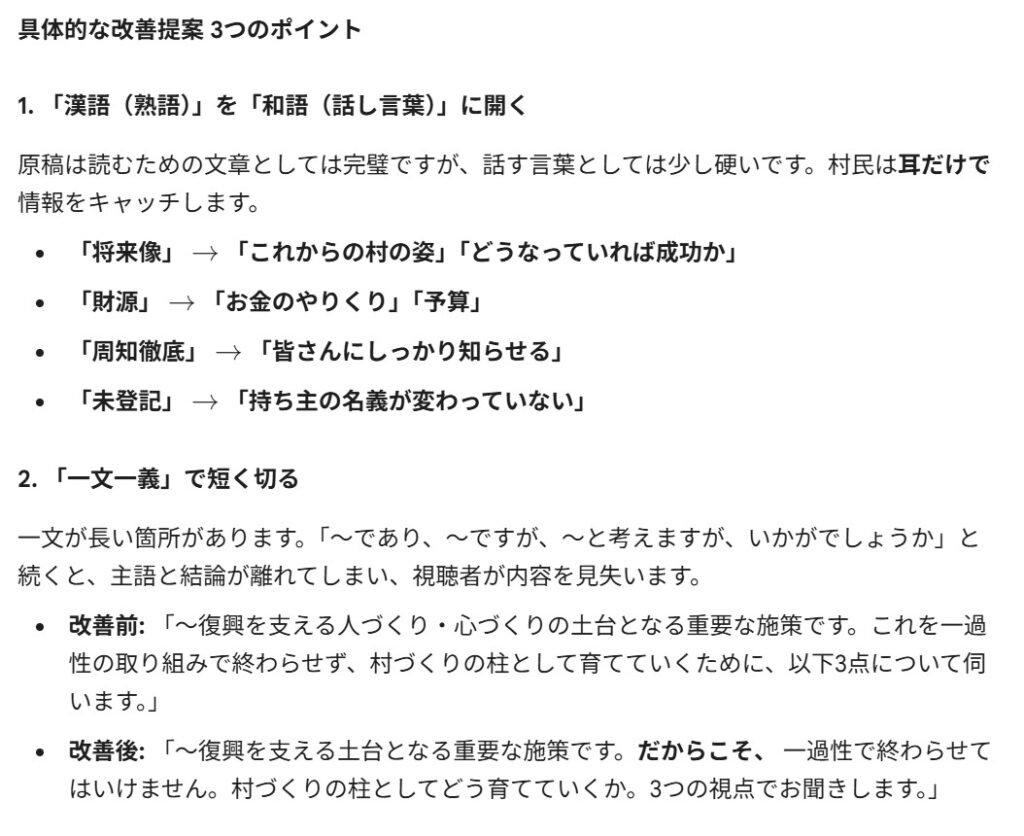 そして、原稿の言い回し等を修正していくと・・・、職員や議員にもわかりやすくなります。また、インターネット中継で見ている村民の方も聞きやすくなりますよ。